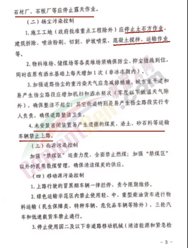 2.城市建成區(qū)所有施工工地土石方工程、所有混凝土攪拌站、城中村改造拆遷工程全部停工。各類渣堆、土堆、料堆全部苫蓋并灑水保濕。停止室外噴涂、粉刷、切割、焊接、護(hù)坡、噴漿作業(yè)。