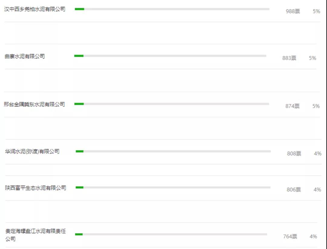 一、邯鄲涉縣金隅水泥3872票。二、四川星船城水泥股份有限公司1560票。三、福州臺泥水泥有限公司位居前三位1537票。四、尖峰水泥1072票。五、漢中西鄉(xiāng)堯柏水泥有限公司988票。六、曲寨水泥有限公司883票。七、邢臺金隅冀東水泥有限公司874票。八、華潤水泥(彌渡)有限公司808票。九、陜西富平生態(tài)水泥有限公司806票。十、貴定海螺盤江水泥有限責(zé)任公司764票。