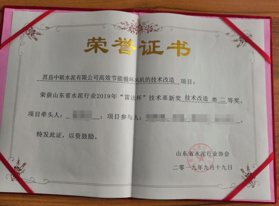 其中,高效節(jié)能循環(huán)風機的技術改造項目榮獲山東省水泥行業(yè)2019年“雷法杯”技術革新獎技術改造類二等獎。
