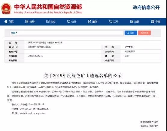 日前,國(guó)家自然資源部發(fā)布《關(guān)于2019年度綠色礦山遴選名單的公示》稱:按照《自然資源部辦公廳關(guān)于做好2019年度綠色礦山遴選工作的通知》(自然資辦函〔2019〕965號(hào))要求,在企業(yè)自評(píng)、第三方評(píng)估、省級(jí)推薦基礎(chǔ)上,經(jīng)實(shí)地抽查、材料審核,共有556家礦山(不含原國(guó)家級(jí)綠色礦山試點(diǎn)單位)通過(guò)遴選。并將通過(guò)遴選的綠色礦山名單進(jìn)行公示,公示時(shí)間:2019年12月25日-12月31日。公示原文如下: