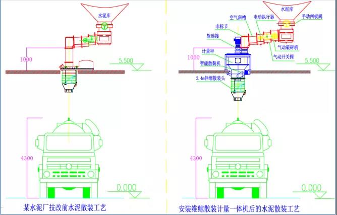 如下圖案例所示,水泥出料口到散裝機(jī)法蘭高度低于0.5米,目前大部分散裝平臺(tái)高度在5.5m以上,散裝罐車多數(shù)在4.3m以下。所有通過(guò)式散裝計(jì)量設(shè)備至少要求斜槽出料口到散裝機(jī)法蘭高度在1m以上。我公司將傳統(tǒng)平臺(tái)安裝的散裝機(jī)改為可以靈活布置的新型散裝機(jī),并利用原有散裝機(jī)的高度和散裝平臺(tái)下方高度來(lái)完成定量散裝的技術(shù)改造。