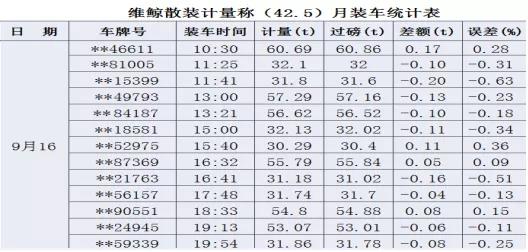維鯨散裝計(jì)量秤目前已在水泥生產(chǎn)企業(yè)中有多個(gè)應(yīng)用案例,取得良好的應(yīng)用效果,以2019在安徽某水泥生產(chǎn)企業(yè)的實(shí)測(cè)數(shù)據(jù)記錄為例,可以看出使用該系統(tǒng)后的計(jì)量精度均保持在1%以內(nèi),在一個(gè)月內(nèi)無(wú)返車打料或加裝的現(xiàn)象,完全可達(dá)到一次裝車完成無(wú)超載出廠的情況。