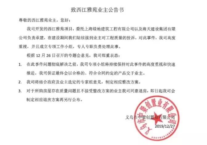 在公告書中,中梁創(chuàng)置業(yè)稱,公司開發(fā)的西江雅苑項(xiàng)目,委托上海綠地建筑工程有限公司以及海天建設(shè)集團(tuán)有限公司負(fù)責(zé)承建,在建設(shè)期間陸續(xù)接到業(yè)主對(duì)工程質(zhì)量的投訴。對(duì)此事件,公司高度重視,并且成立專項(xiàng)工作小組,專人專職負(fù)責(zé)處理此事。