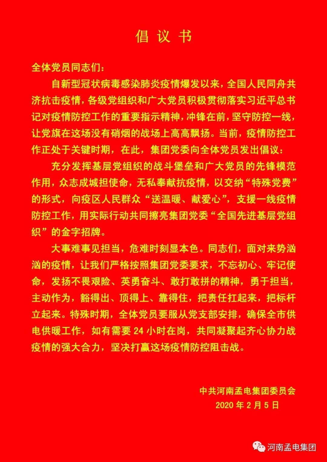 2月5日上午,孟電集團(tuán)黨委書記、董事長(zhǎng)范海濤,將集團(tuán)208名黨員主動(dòng)交納的20萬(wàn)元黨費(fèi)交到了市委組織部,助力疫情防控工作。