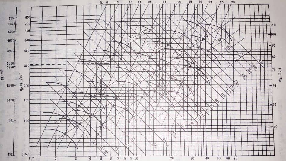 所謂型譜(圖1為鍋爐引風(fēng)機(jī)系列型譜)是對(duì)于不同的風(fēng)機(jī)運(yùn)行參數(shù)有對(duì)應(yīng)模型機(jī)與之對(duì)應(yīng),這樣才能保證風(fēng)機(jī)的設(shè)計(jì)符合風(fēng)機(jī)的實(shí)際工況。若找不到相對(duì)應(yīng)的風(fēng)力模型,風(fēng)機(jī)設(shè)計(jì)就沒(méi)有理論數(shù)據(jù)支撐。一般的風(fēng)機(jī)廠家會(huì)選擇在相近的風(fēng)力模型中進(jìn)行替代設(shè)計(jì),實(shí)際運(yùn)行工況與設(shè)計(jì)工況有較大的偏差。導(dǎo)致風(fēng)機(jī)實(shí)際運(yùn)行效率偏低。