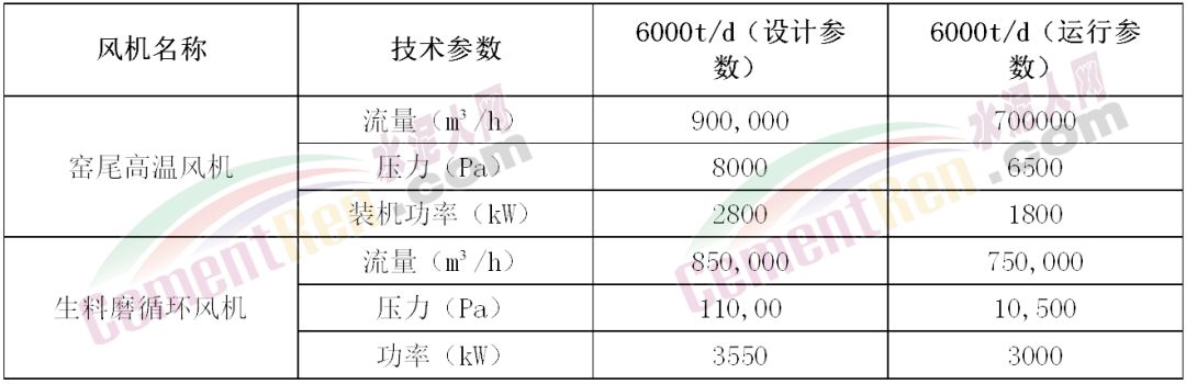而風(fēng)機(jī)設(shè)計(jì)參數(shù)余量系數(shù)過(guò)大,則實(shí)際運(yùn)行參數(shù)遠(yuǎn)低于設(shè)計(jì)參數(shù)。下表為6000t/d產(chǎn)量規(guī)模的水泥熟料生產(chǎn)線(窯尾高溫風(fēng)機(jī)以及生料磨循環(huán)風(fēng)機(jī))原始設(shè)計(jì)參數(shù)與實(shí)際運(yùn)行參數(shù)對(duì)比: