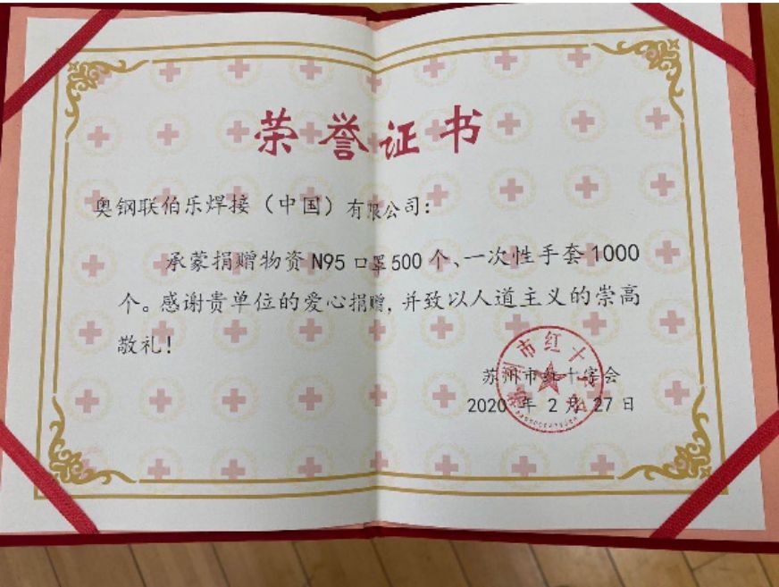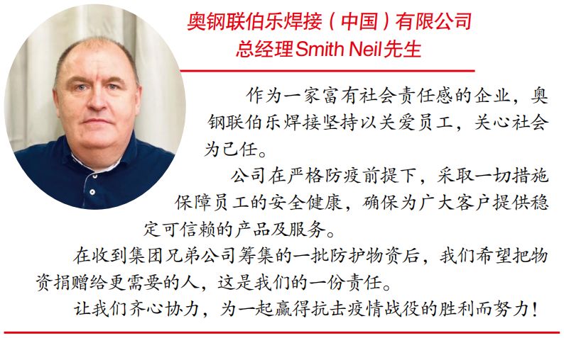 奧鋼聯(lián)伯樂焊接(中國)有限公司總經(jīng)理 Neil Smith先生說:作為一家富有社會責任感的企業(yè),奧鋼聯(lián)伯樂焊接堅持以關(guān)愛員工,關(guān)心社會為己任。 公司在嚴格防疫前提下,采取一切措施保障員工的安全健康,確保為廣大客戶提供穩(wěn)定可信賴的產(chǎn)品及服務(wù)。在收到集團兄弟公司籌集的一批防護物資后,我們希望把物資捐贈給更需要的人,這是我們的一份責任。