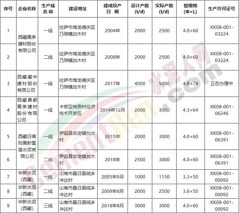 西藏自治區(qū)水泥熟料生產(chǎn)線清單