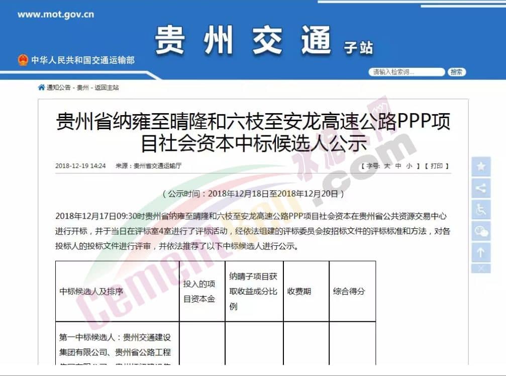 2018年12月19日,總投資達(dá)596億元的貴州省納雍至晴隆和六枝至安龍高速公路PPP項(xiàng)目社會(huì)資本項(xiàng)目納晴子項(xiàng)目和六安子項(xiàng)目在貴州交通廳網(wǎng)站發(fā)布了中標(biāo)結(jié)果。