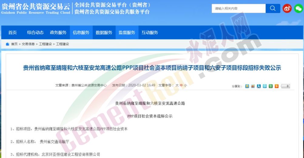 3月2日:貴州省公共資源交易中心發(fā)布《貴州省納雍至晴隆和六枝至安龍高速公路PPP項(xiàng)目社會(huì)資本項(xiàng)目納晴子項(xiàng)目和六安子項(xiàng)目標(biāo)段招標(biāo)失敗公示》。