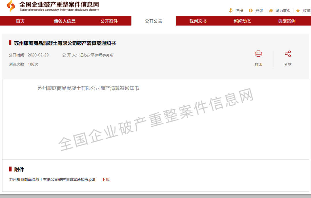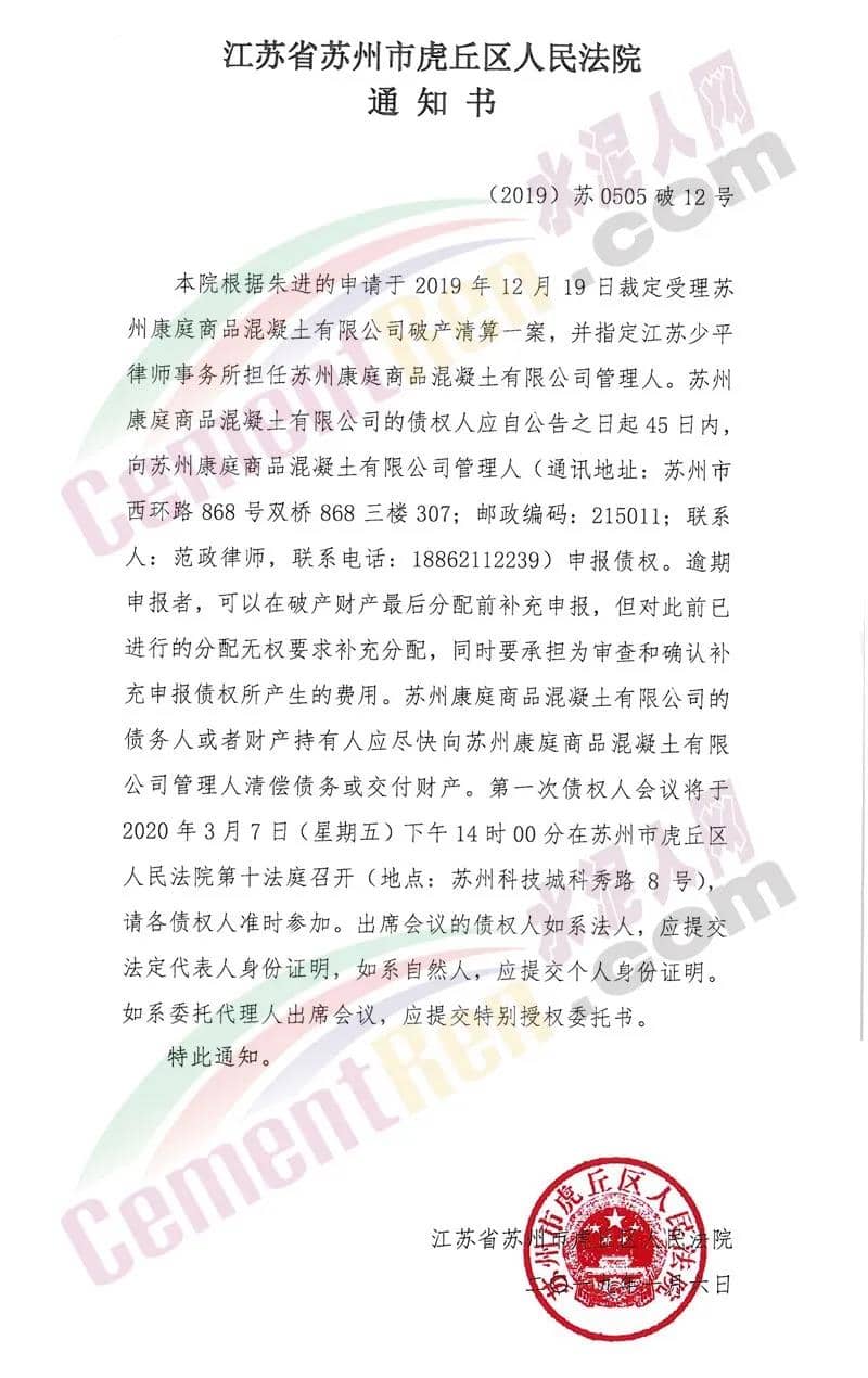 通知書(shū)稱:根據(jù)朱進(jìn)的申請(qǐng)于2019年12月19日裁定受理蘇州康庭商品混凝土有限公司破產(chǎn)清算一案 ,并指定律所擔(dān)任其管理人。蘇州康庭商品混凝土有限公司的債權(quán)人自公告之日起45日內(nèi)可申請(qǐng)債權(quán)。