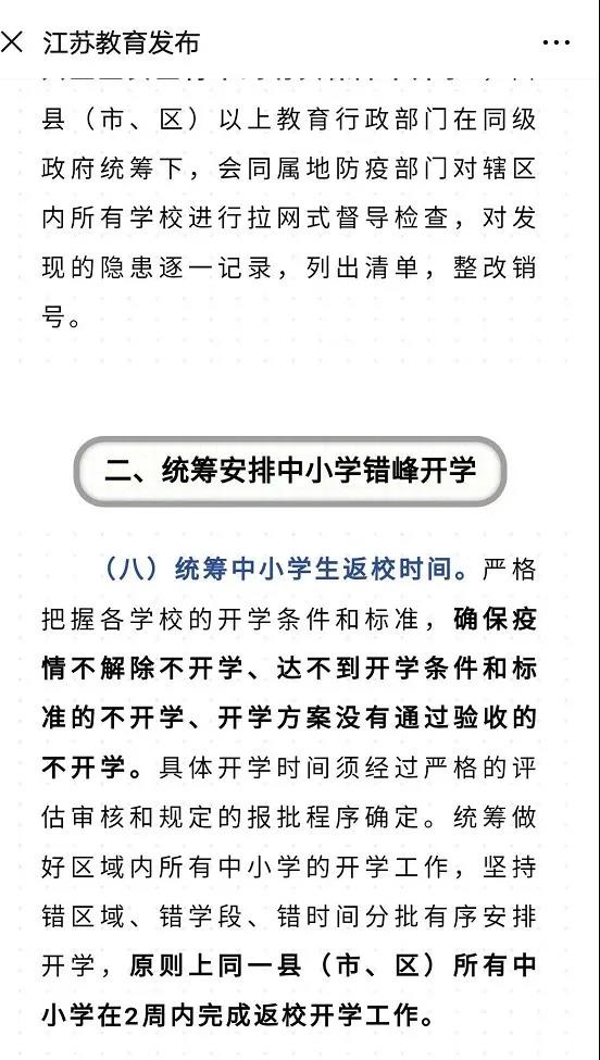 隨即,江蘇省教育廳發(fā)布了通知:原則上同一地縣(市、區(qū))所有中小學(xué)在兩周內(nèi)完成返校開學(xué)工作!