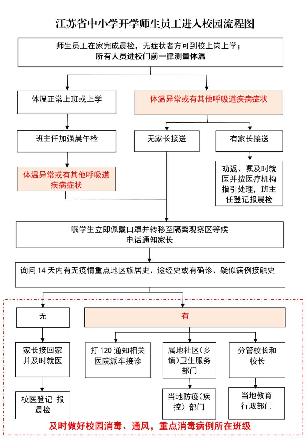 (十二)落實(shí)晨午檢制度。學(xué)校每日要以班級為單位進(jìn)行晨午檢(流程圖見文后),檢查本班學(xué)生出勤及健康情況;每天入校、離校(住校生晨起、午睡、晚寢)前,教師分工定人檢查學(xué)生健康狀況并做好記錄,學(xué)校匯總后向?qū)俚亟逃块T報(bào)告。如發(fā)現(xiàn)有疑似新冠肺炎早期癥狀(如發(fā)熱、乏力、干咳、腹瀉等)和異常情況的,立即啟動(dòng)應(yīng)急預(yù)案,做好以下幾方面應(yīng)對措施: