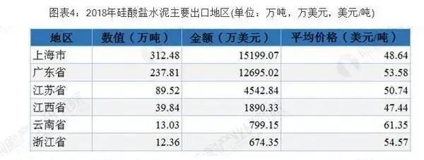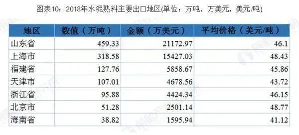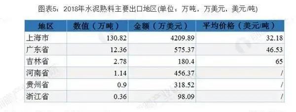 我國的水泥出口地區(qū)主要集中在上海、廣東和江蘇省份,2018年這從三個地區(qū)出口的比重超過87%。之所以集中在這一地區(qū),主要是因為這些地區(qū)集中了我國主要的水泥出口企業(yè)如海螺、華潤等,廣東緊鄰港澳為主要供應(yīng)區(qū)域,上海和江蘇長期保持一定的向美國出口量。