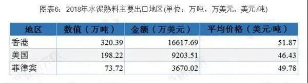 2018年我國水泥熟料出口主要流向香港、美國、菲律賓,香港地區(qū)數(shù)量最大為320.39萬噸,出口創(chuàng)收1.66億美元;其次是美國,出口量達(dá)198.22萬噸,出口創(chuàng)收9203.51萬美元。