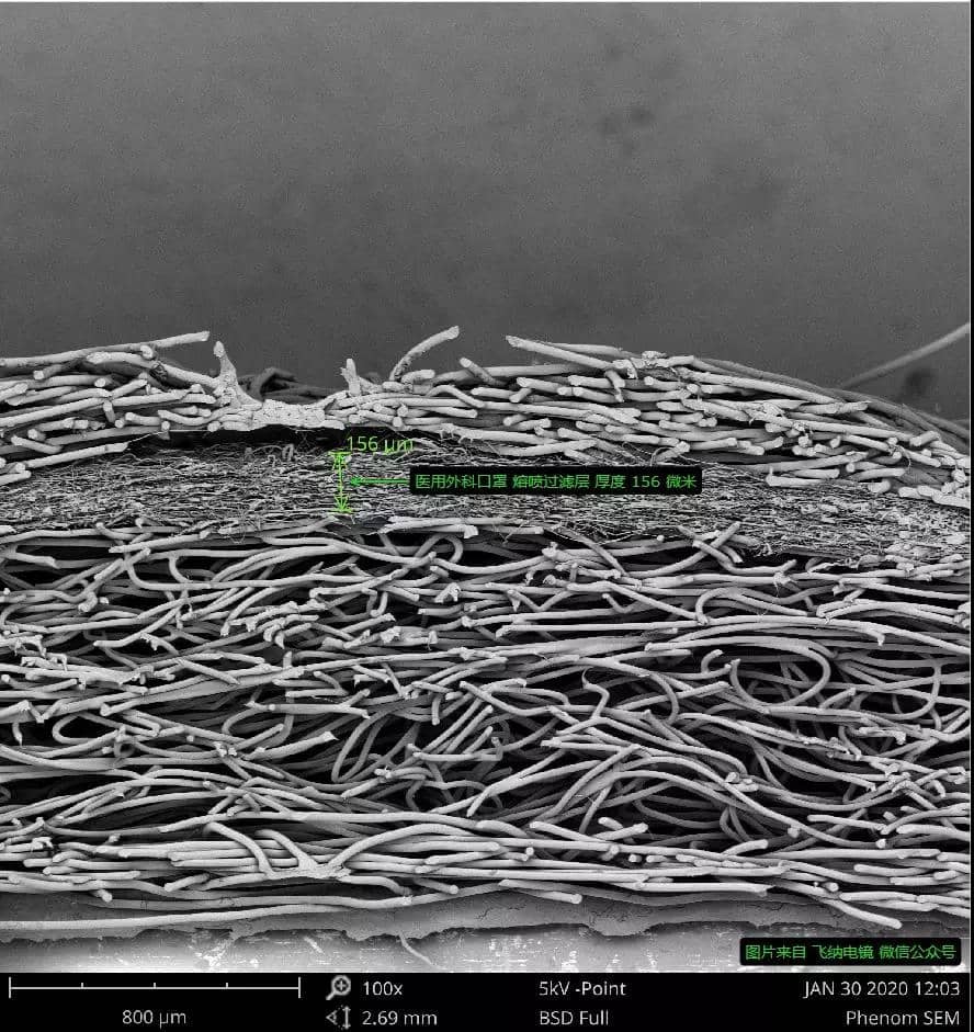 對(duì)比了 N95 口罩和醫(yī)用外科口罩的截面圖,掃描電鏡圖片可以清晰看出,外科口罩的熔噴布厚度為 156 微米,而 N95 級(jí)口罩的熔噴布層厚度為 521 微米,是外科口罩的 3 倍 。