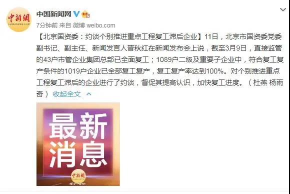 3月11日,北京市國資委黨委副書記、副主任、新聞發(fā)言人晉秋紅在新聞發(fā)布會上說,截至3月9日,直接監(jiān)管的43戶市管企業(yè)集團(tuán)總部已全面復(fù)工;1089戶二級及重要子企業(yè)中,符合復(fù)工復(fù)產(chǎn)條件的1019戶企業(yè)已全部復(fù)工復(fù)產(chǎn),復(fù)工復(fù)產(chǎn)率達(dá)到100%。對個別推進(jìn)重點(diǎn)工程復(fù)工滯后的企業(yè)進(jìn)行了約談,督促其提高認(rèn)識,加快復(fù)工進(jìn)度。