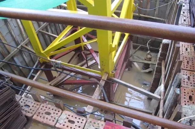基礎(chǔ)下沉形式是指塔吊基礎(chǔ)底面低于±0.00標(biāo)高,置于地下室基坑底部標(biāo)高位置的形式。對于這種塔吊基礎(chǔ)處理形式,應(yīng)關(guān)注塔吊基礎(chǔ)部分的排水,避免積水。廈門市去年曾發(fā)生一起由于塔吊基礎(chǔ)節(jié)積水,影響司機(jī)、檢查人員檢查而未能及時發(fā)現(xiàn)基礎(chǔ)節(jié)底座焊縫裂縫,再加上焊縫處鋼材疲勞損傷嚴(yán)重而發(fā)生的倒塔事故。