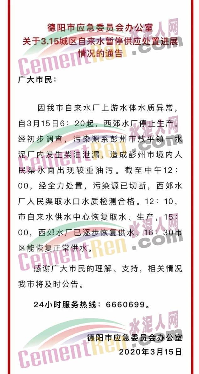 經(jīng)過努力,3月15日12點(diǎn)10分,經(jīng)連續(xù)監(jiān)測,取水口水質(zhì)達(dá)標(biāo),水廠恢復(fù)取水,15點(diǎn)城區(qū)逐步恢復(fù)供水,截止16點(diǎn)30分,市區(qū)恢復(fù)正常供水。