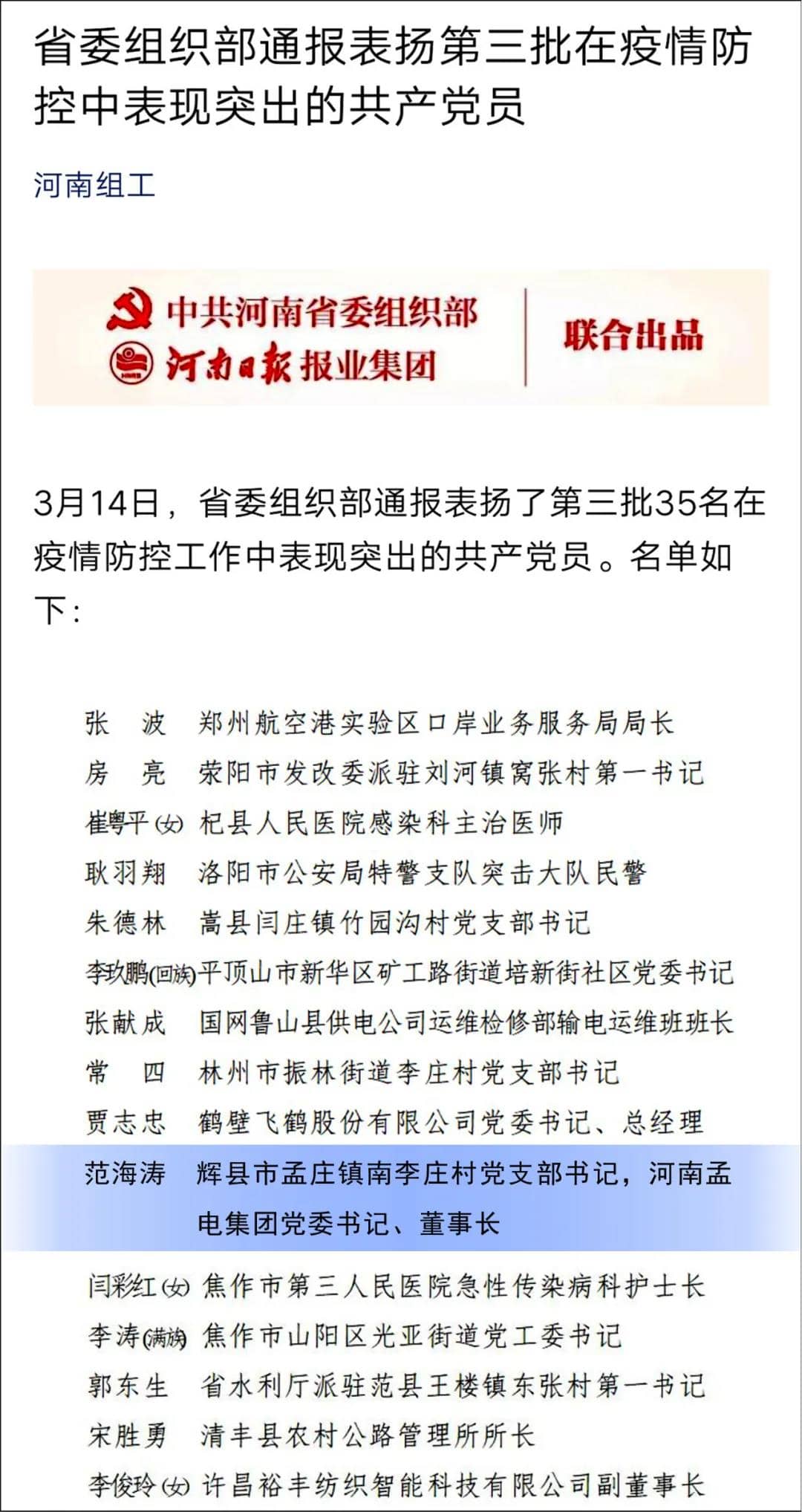 3月14日,河南省委組織部通報(bào)表?yè)P(yáng)了第三批在疫情防控工作中表現(xiàn)突出的共產(chǎn)黨員,輝縣市孟莊鎮(zhèn)南李莊村黨支部書(shū)記,河南孟電集團(tuán)黨委書(shū)記、董事長(zhǎng)范海濤名列其中。