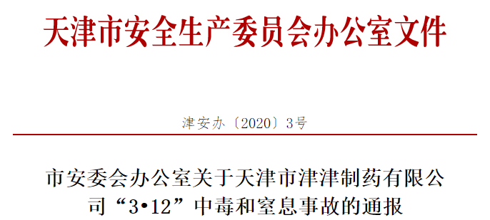 3月17日,天津市安全生產(chǎn)委員會(huì)辦公室發(fā)布《關(guān)于天津市津津制藥有限公司“3•12”中毒和窒息事故的通報(bào)》 稱(chēng):事故暴露出該企業(yè)安全意識(shí)淡薄,沒(méi)有認(rèn)真吸取同類(lèi)事故教訓(xùn),進(jìn)入受限空間作業(yè)管理失控等突出問(wèn)題,以及企業(yè)安全管理混亂、地方監(jiān)管部門(mén)受限空間作業(yè)安全專(zhuān)項(xiàng)整治不到位、安全監(jiān)管失之于軟等突出問(wèn)題。通報(bào)原文如下: