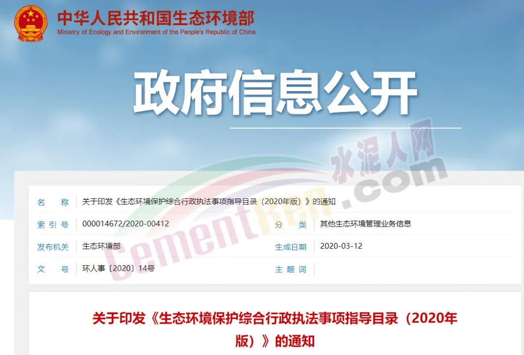 獲取《生態(tài)環(huán)境保護(hù)綜合行政執(zhí)法事項(xiàng)指導(dǎo)目錄(2020年版)》全文,請聯(lián)系水泥人網(wǎng)主編:18911461190(微信同號)