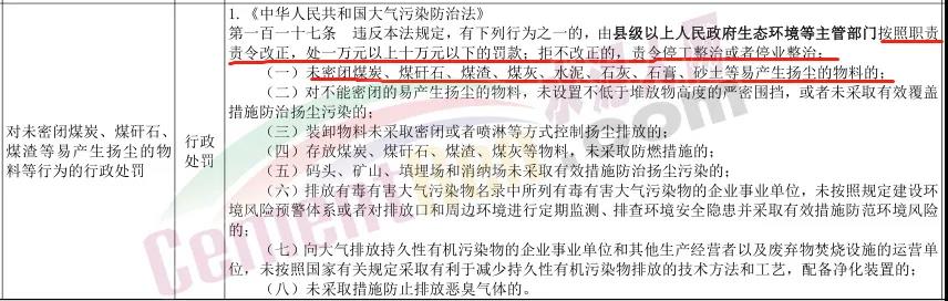 據(jù)水泥人網(wǎng)了解,該《指導(dǎo)目錄》明確指出,如果水泥企業(yè)存在未密閉煤炭、煤矸石、煤渣、煤灰、水泥、石灰、石膏、砂土等易產(chǎn)生揚(yáng)塵的物料的現(xiàn)象,將依照第一百一十七條之規(guī)定,由縣級以上人民政府生態(tài)環(huán)境等主管部門按照職責(zé)責(zé)令改正,處一萬元以上十萬元以下的罰款;拒不改正的,責(zé)令停工整治或者停業(yè)整治。