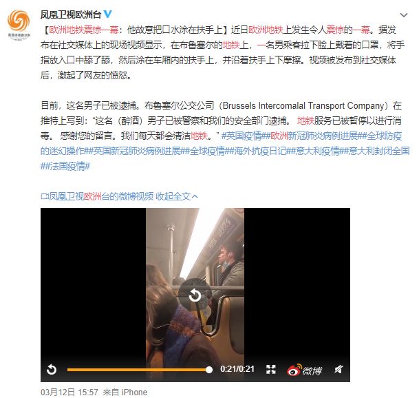 那么真實(shí)情況是這樣的嗎?小編認(rèn)真了解了一下,發(fā)現(xiàn)視頻中的事件真實(shí)存在,但事發(fā)地并不在中國(guó),而是在歐洲。而且在3月12日,鳳凰衛(wèi)視歐洲臺(tái)的官方微博(@鳳凰衛(wèi)視歐洲臺(tái))已對(duì)該事件進(jìn)行過報(bào)道。這令人震驚的一幕發(fā)生在布魯塞爾的地鐵上。目前,這名男子已被捕。