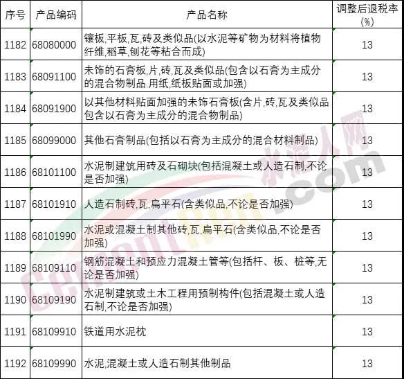 日前,國家財政部發(fā)布關于提高部分產品出口退稅率的公告,提高出口退稅率的產品清單中水泥,混凝土或人造石制其他制品等十余類產品調整后退稅率為13%,相關類如下: