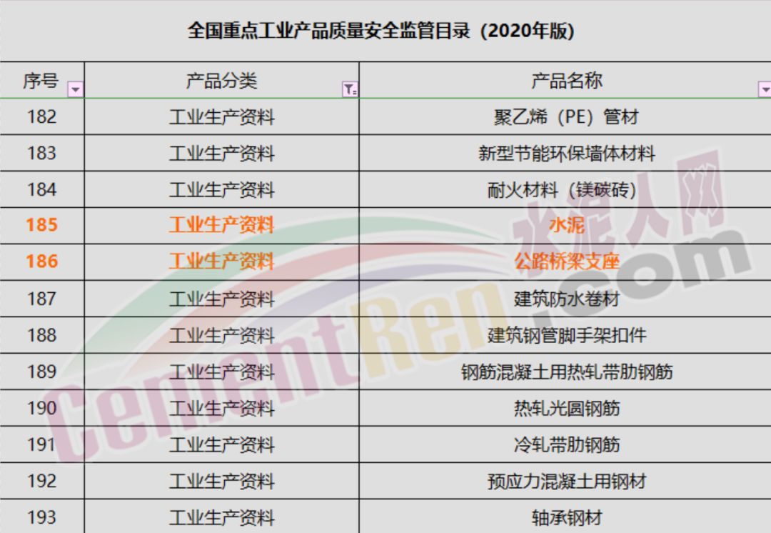 3月17日,國家市場監(jiān)督管理總局官網(wǎng)發(fā)布了《全國重點(diǎn)工業(yè)產(chǎn)品質(zhì)量安全監(jiān)管目錄(2020年版)》文件,要求抓好流通領(lǐng)域重點(diǎn)產(chǎn)品質(zhì)量安全監(jiān)管。特別是針對風(fēng)險(xiǎn)高、已出現(xiàn)區(qū)域性或行業(yè)性質(zhì)量安全問題苗頭的產(chǎn)品,要及時(shí)開展專項(xiàng)整治,多措并舉、綜合施策、嚴(yán)控險(xiǎn)情。水泥人網(wǎng)關(guān)注到,水泥、鋼筋等重點(diǎn)建筑材料物資位列其中。