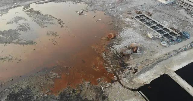 今年3月中旬,記者航拍的畫面顯示,核心區(qū)內(nèi)仍有一個直徑超百米的大坑,內(nèi)有大片紅棕色液體,一旁停放著三臺挖土機(jī)。天嘉宜公司的廠房如今已基本拆除完畢,現(xiàn)已變成一片空地,僅遺留少數(shù)建筑殘骸和建筑垃圾。園區(qū)內(nèi)部分區(qū)域有殘留的黑色污染物,個別低洼地區(qū)能看到黑色的積水。