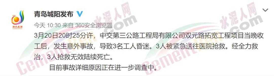 3月20日20時25分許,中交第三公路工程局有限公司雙元路拓寬工程項目當晚收工后,發(fā)生意外事故,導(dǎo)致3名工人昏迷。3人被緊急送往醫(yī)院搶救。經(jīng)全力救治,3人搶救無效陸續(xù)死亡。