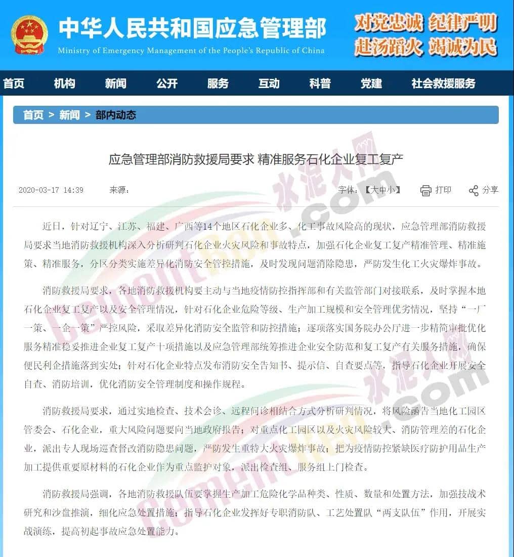 江蘇、北京、山西等地也積極響應(yīng)要求,推動危化品生產(chǎn)企業(yè)復(fù)工復(fù)產(chǎn)工作,以及企業(yè)安全風(fēng)險和事故隱患排查整治等各項工作,堅決防范遏制各類事故發(fā)生。去年“3.21”響水爆炸事故的影響仍未散去,我們更應(yīng)當引以為戒,吸取事故教訓(xùn),時刻保持警惕,牢記紅線,守住安全。