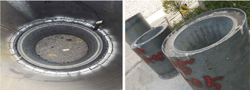 拆除4~5級舊下料管,重新制作直徑D950mm鐵質(zhì)外筒,內(nèi)部安裝內(nèi)徑為Φ700mm微晶高溫耐磨筒,在外筒內(nèi)壁上焊接V80扒釘,然后在內(nèi)壁的錨固件之間鑲貼30mm的NJS950型納米隔熱板,填充澆注料,在合適部位預(yù)留清灰孔。施工中要求上下的每節(jié)微晶高溫耐磨筒必須卡入自身的端頭卡槽內(nèi),接縫處無爬臺現(xiàn)象;確保納米隔熱板鑲貼嚴(yán)密、澆注料厚度均勻。4~5級下料管總長度為48m,總的使用面積為143m2,詳細(xì)施工見下圖-1和圖-2。