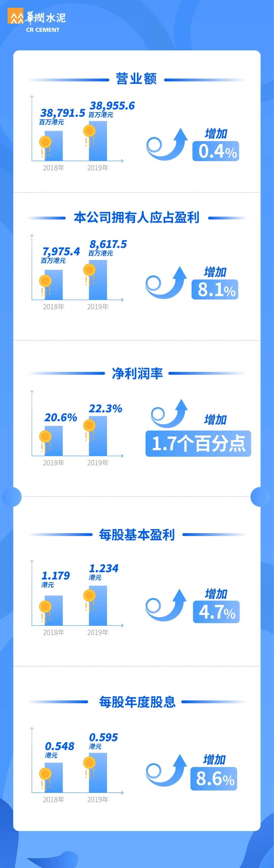 3月27日,華潤(rùn)水泥發(fā)布2019年全年業(yè)績(jī)。2019年本公司擁有人應(yīng)占盈利增加8.1%至86.2億港元,創(chuàng)歷史新高;全年派息59.5港仙、派息率達(dá)48.2%。公司立足華南、穩(wěn)中求進(jìn),推動(dòng)轉(zhuǎn)型創(chuàng)新,積極探索產(chǎn)業(yè)鏈延伸的機(jī)會(huì),在骨料、裝配式建筑及人造石材等新業(yè)務(wù)方面均取得突破。