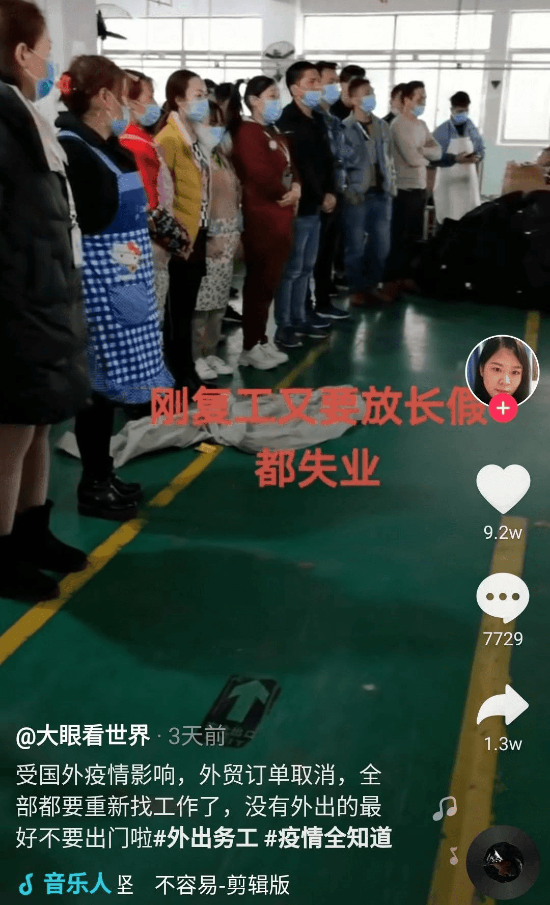 剛剛從國內(nèi)延遲復(fù)產(chǎn)復(fù)工的第一波壓力中走出來的中國外貿(mào)企業(yè),又將迎面承接第二波壓力:由于國外疫情控制導(dǎo)致的延遲消費、 訂單擱置或者取消,不得不剛開工即按下暫停鍵。廠房租金和稅費要付,工人工資要付,部分企業(yè)已開始裁員……中國近五千萬外貿(mào)從業(yè)人員正在集體承擔(dān)壓力。放假至少還有回來復(fù)工的機會,但下面這些企業(yè)和員工就沒這么幸運了。部分企業(yè)訂單取消,物料也跟不上,索性裁員一勞永逸,廠子也幾近放棄狀態(tài)。某企業(yè)半個月前還在大量招工,突然就宣布噩耗,門店關(guān)閉,臨時工隊伍解散,廠區(qū)內(nèi)有很多工人不禁潸然淚下,不知是在為自己的遭遇難過,還是在為整個家庭的未來擔(dān)憂。