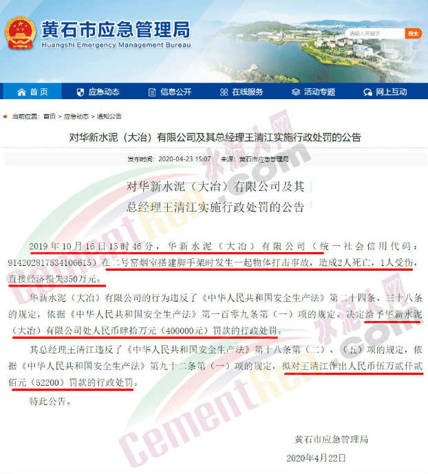 一、對華新水泥(大冶)有限公司及其總經(jīng)理王清江實(shí)施行政處罰的公告