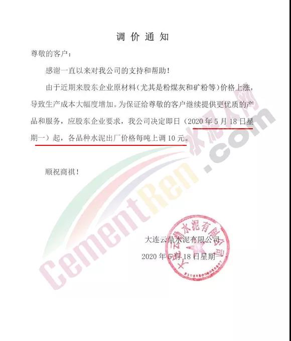 根據(jù)市場變化,我公司決定于2020年5月16日12:00對各水泥品種價格進(jìn)行以下相關(guān)調(diào)整:M32.5袋裝、散裝上調(diào)40元/噸,P.C42.5袋裝、散裝上調(diào)40元/噸,P.O42.5袋裝、散裝上調(diào)20元/噸。