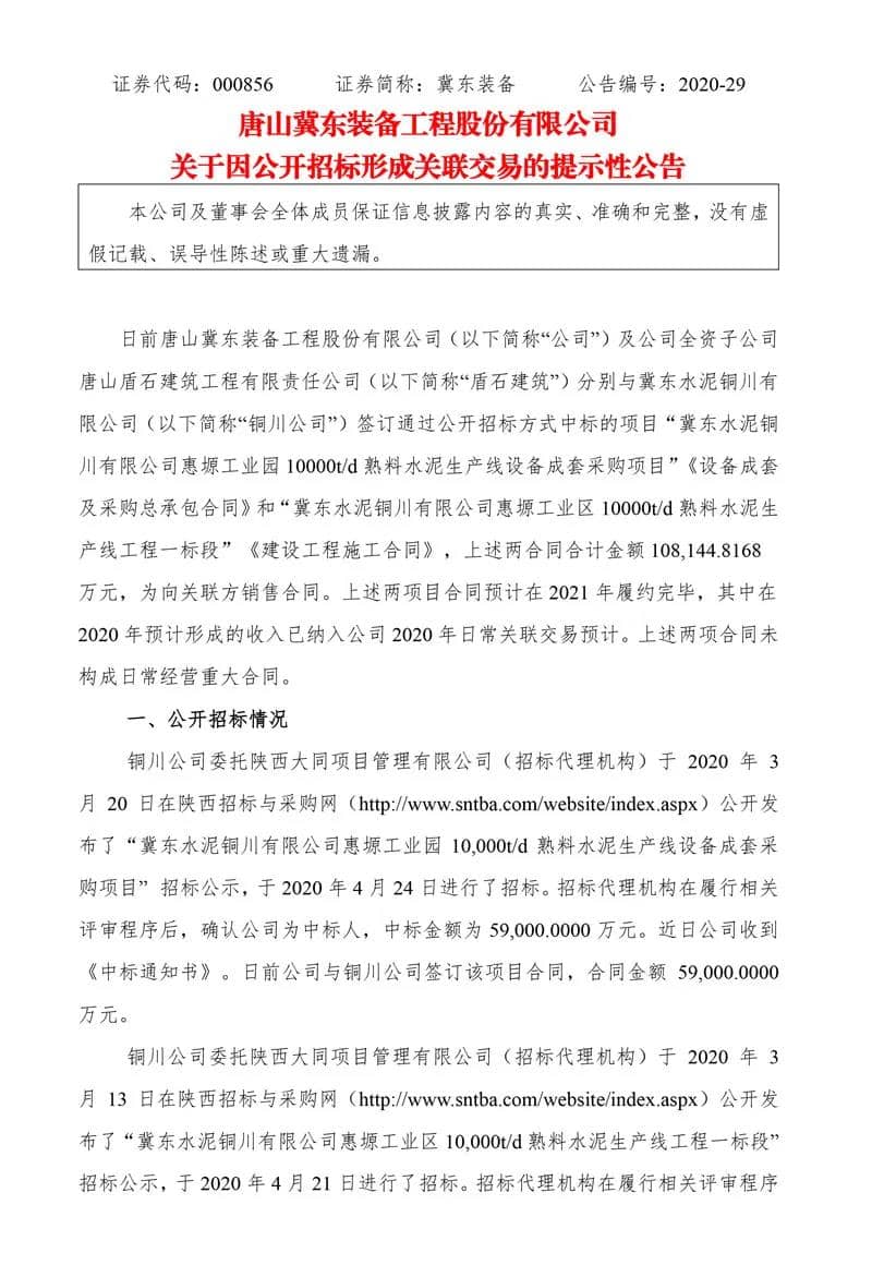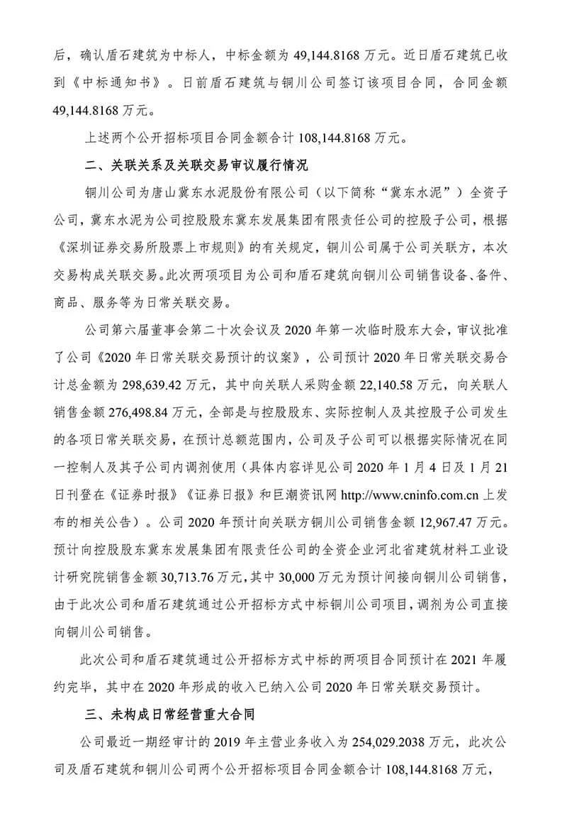 冀東裝備公布,日前公司及公司全資子公司唐山盾石建筑工程有限責(zé)任公司(“盾石建筑”)分別與冀東水泥銅川有限公司簽訂通過(guò)公開招標(biāo)方式中標(biāo)的項(xiàng)目“冀東水泥銅川有限公司惠塬工業(yè)園10000t/d熟料水泥生產(chǎn)線設(shè)備成套采購(gòu)項(xiàng)目”《設(shè)備成套及采購(gòu)總承包合同》和“冀東水泥銅川有限公司惠塬工業(yè)區(qū)10000t/d熟料水泥生產(chǎn)線工程一標(biāo)段”《建設(shè)工程施工合同》,上述兩合同合計(jì)金額10.81億元,為向關(guān)聯(lián)方銷售合同。上述兩項(xiàng)目合同預(yù)計(jì)在2021年履約完畢,其中在2020年預(yù)計(jì)形成的收入已納入公司2020年日常關(guān)聯(lián)交易預(yù)計(jì)。