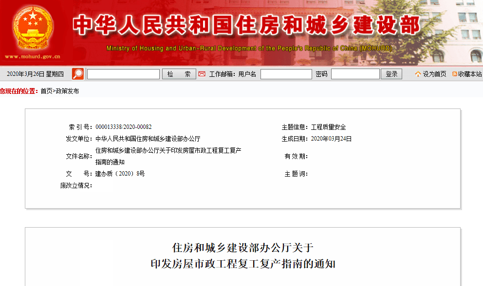 2020年3月,住房和城鄉(xiāng)建設部辦公廳關于印發(fā)房屋市政工程復工復產指南的通知,要求:嚴格把好材料、設備等進場質量安全關。嚴禁將存在安全隱患的設備用于施工中,嚴禁將不合格的材料用到工程上;加強工程質量安全管理,堅決杜絕盲目搶工期,遏制質量安全事故發(fā)生。確需調整工期的,應經過專家論證,確保施工安全;加強分部分項工程質量安全驗收管理,嚴禁將不合格工程當作合格工程驗收后進入下道工序施工。對發(fā)現的工程質量問題,嚴格跟蹤督促相關責任單位和責任人整改到位。