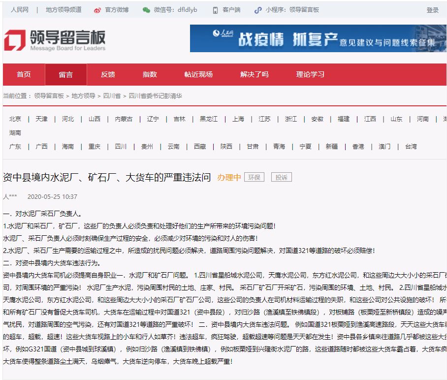 其留言稱,四川省星船城水泥公司、天鷹水泥公司、東方紅水泥公司以及周邊大大小小的采石廠礦石廠企業(yè)負(fù)責(zé)人在司機(jī)材料運(yùn)輸過(guò)程中嚴(yán)重失職,并且對(duì)公共設(shè)施的破壞!幾乎所有水泥廠和所有礦石廠沒(méi)有督促大貨車(chē)司機(jī),大貨車(chē)在運(yùn)輸過(guò)程中對(duì)國(guó)道321(資中縣段),對(duì)歸沙路(漁溪鎮(zhèn)至鐵佛鎮(zhèn)段),對(duì)板鋪路(板栗婭至新橋鎮(zhèn)段)造成的噪聲擾民、空氣擾民,對(duì)道路周?chē)目諝馕廴?,?duì)國(guó)道321等道路的嚴(yán)重破壞!