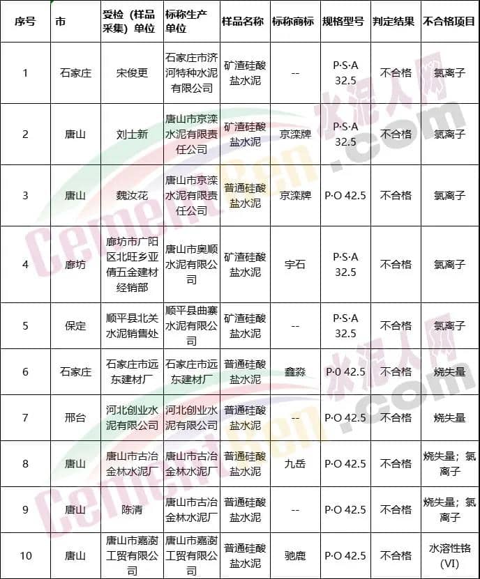 河北省河北省市場(chǎng)監(jiān)督管理局發(fā)布通報(bào)稱,抽查水泥、建筑防水卷材等21類產(chǎn)品共檢出不合格樣品188批次,不合格樣品檢出率為8.6%,其中水泥產(chǎn)品10個(gè)批次不合格,不合格項(xiàng)目涉及氯離子、燒失量以及水溶性鉻(Ⅵ)。