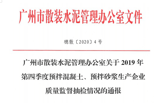 廣州市散裝水泥管理辦公室發(fā)布《關(guān)于2019年第四季度預(yù)拌混凝土、預(yù)拌砂漿生產(chǎn)企業(yè)質(zhì)量監(jiān)督抽檢情況的通報(bào)》,共抽檢水泥190份,不合格4份。其中不合格水泥涉及兩家企業(yè),分別為華潤(rùn)水泥(平南)有限公司、英德龍山水泥有限責(zé)任公司,不合格項(xiàng)目均為燒失量。