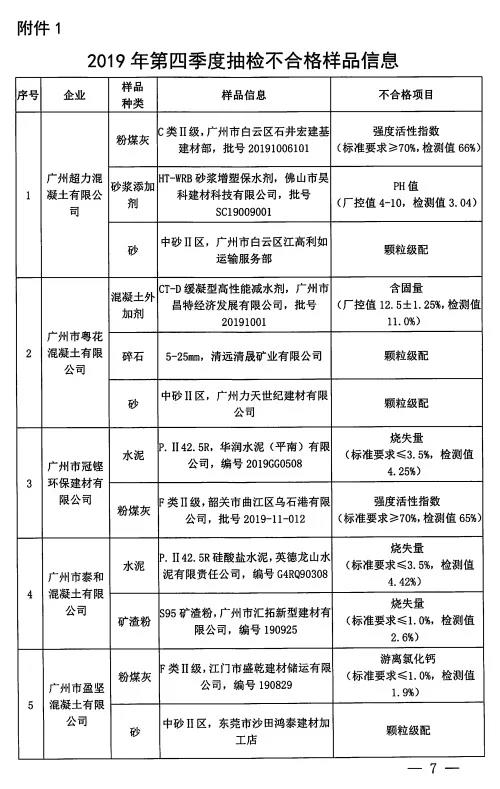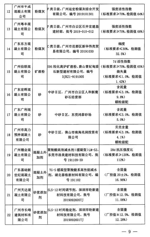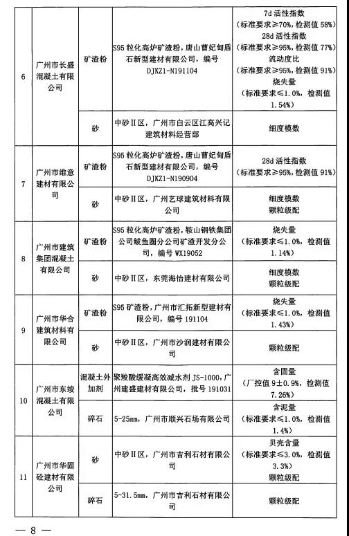 對(duì)上上述監(jiān)督抽檢不合格的企業(yè)列為重點(diǎn)檢查對(duì)象,廣州市散辦將加大監(jiān)管力度,重點(diǎn)核查上述企業(yè)質(zhì)量管理情況,并不定期開(kāi)展質(zhì)量抽檢 。將本次抽檢的不合格原材料列入不合格原材料名錄,建議全市預(yù)拌混凝土企業(yè),預(yù)拌砂漿企業(yè)謹(jǐn)慎選用名錄內(nèi)的原材料。