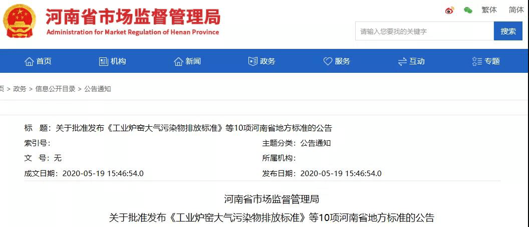 河南省市場(chǎng)監(jiān)督管理局2020年29號(hào)公告批準(zhǔn)發(fā)布新修訂的《工業(yè)爐窯大氣污染物排放標(biāo)準(zhǔn)》(DB41/1066-2020),自2020年6月1日起實(shí)施。