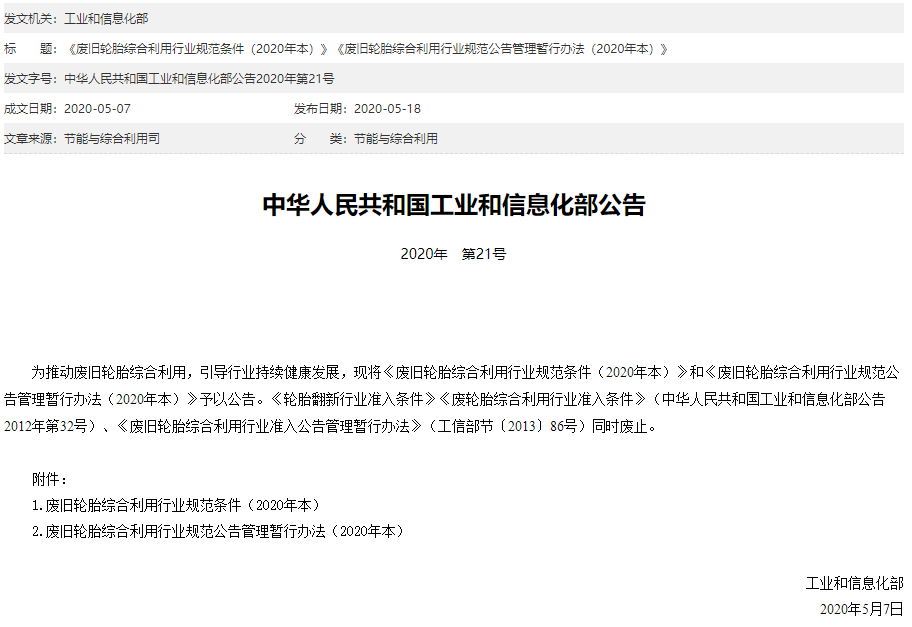 為推動(dòng)廢舊輪胎綜合利用,引導(dǎo)行業(yè)持續(xù)健康發(fā)展,工業(yè)和信息化部日前公告《廢舊輪胎綜合利用行業(yè)規(guī)范條件(2020年本)》和《廢舊輪胎綜合利用行業(yè)規(guī)范公告管理暫行辦法(2020年本)。