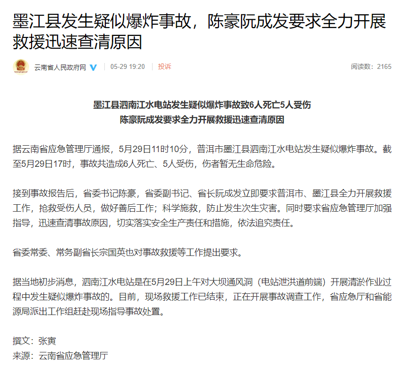 據(jù)云南省應(yīng)急管理廳通報,5月29日11時10分,普洱市墨江縣泗南江水電站發(fā)生疑似爆炸事故。截至5月29日17時,事故共造成6人死亡、5人受傷,傷者暫無生命危險。