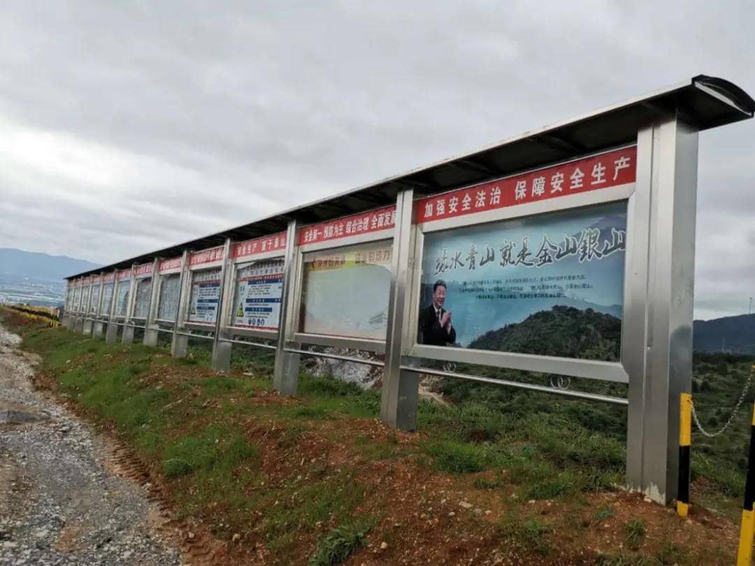 (1)作業(yè)現(xiàn)場。一方面實行清潔生產(chǎn),購買灑水車進行道路灑水降塵,定期檢查維護收塵設(shè)備,清除設(shè)備積塵、油污,設(shè)備備品備件歸類整齊擺放到指定位置,收集廢油、白色垃圾等下山處理,確保作業(yè)現(xiàn)場清潔。另一方面加強形象宣傳,在礦山視野開闊位置設(shè)置參觀平臺并地面硬化,設(shè)置宣傳欄和宣傳海報,完善齊全礦山現(xiàn)場安全警示標示牌。