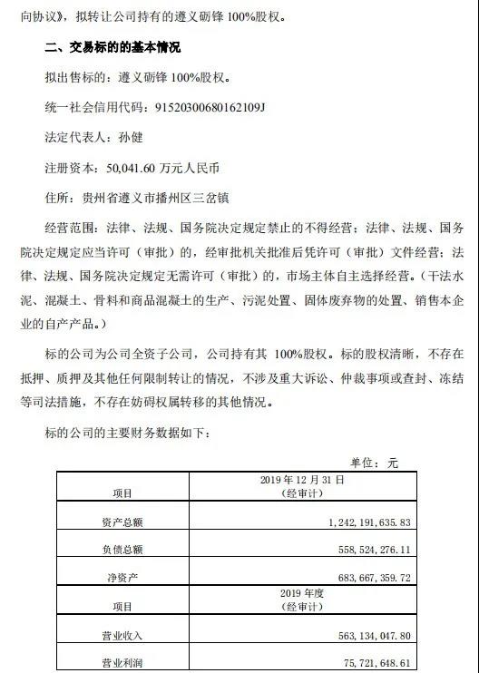 提請(qǐng)廣大投資者注意投資風(fēng)險(xiǎn)。交易標(biāo)的的基本情況擬出售標(biāo)的:遵義礪鋒 100%股權(quán)。統(tǒng)一社會(huì)信用代碼:91520300680162109J 法定代表人:孫健注冊(cè)資本:50,041.60 萬(wàn)元人民幣住所:貴州省遵義市播州區(qū)三岔鎮(zhèn)經(jīng)營(yíng)范圍:法律、法規(guī)、國(guó)務(wù)院決定規(guī)定禁止的不得經(jīng)營(yíng);法律、法規(guī)、國(guó)務(wù)院決定規(guī)定應(yīng)當(dāng)許可(審批)的,經(jīng)審批機(jī)關(guān)批準(zhǔn)后憑許可(審批)文件經(jīng)營(yíng);法律、法規(guī)、國(guó)務(wù)院決定規(guī)定無(wú)需許可(審批)的,市場(chǎng)主體自主選擇經(jīng)營(yíng)。(干法水泥、混凝土、骨料和商品混凝土的生產(chǎn)、污泥處置、固體廢棄物的處置、銷(xiāo)售本企業(yè)的自產(chǎn)產(chǎn)品。)標(biāo)的公司為公司全資子公司,公司持有其 100%股權(quán)。標(biāo)的股權(quán)清晰,不存在抵押、質(zhì)押及其他任何限制轉(zhuǎn)讓的情況,不涉及重大訴訟、仲裁事項(xiàng)或查封、凍結(jié)等司法措施,不存在妨礙權(quán)屬轉(zhuǎn)移的其他情況。公告全文如下: