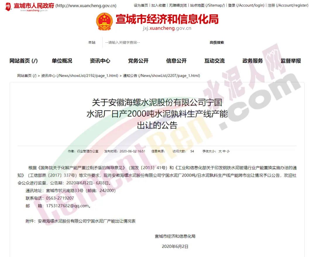 6月2日宣城市人民政策發(fā)布《關(guān)于安徽海螺水泥股份有限公司寧國水泥廠日產(chǎn)2000噸水泥孰料生產(chǎn)線產(chǎn)能出讓的公告》稱,根據(jù)《國務院關(guān)于化解產(chǎn)能嚴重過剩矛盾的指導意見》(國發(fā)〔2013〕41號)和《工業(yè)和信息化部關(guān)于印發(fā)鋼鐵水泥玻璃行業(yè)產(chǎn)能置換實施辦法的通知》(工信部原〔2017〕337號)等文件要求,現(xiàn)將安徽海螺水泥股份有限公司寧國水泥廠2000噸/日水泥孰料生產(chǎn)線產(chǎn)能跨市出讓情況予以公告,歡迎社會公眾進行監(jiān)督,公告期:2020年6月2日- 6月8日。